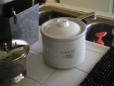 i'm still lecturing the smallish crock-pot - ostensibly for dips - that came with our big oval white one when new - there's water in it right now trying to know of its heats...