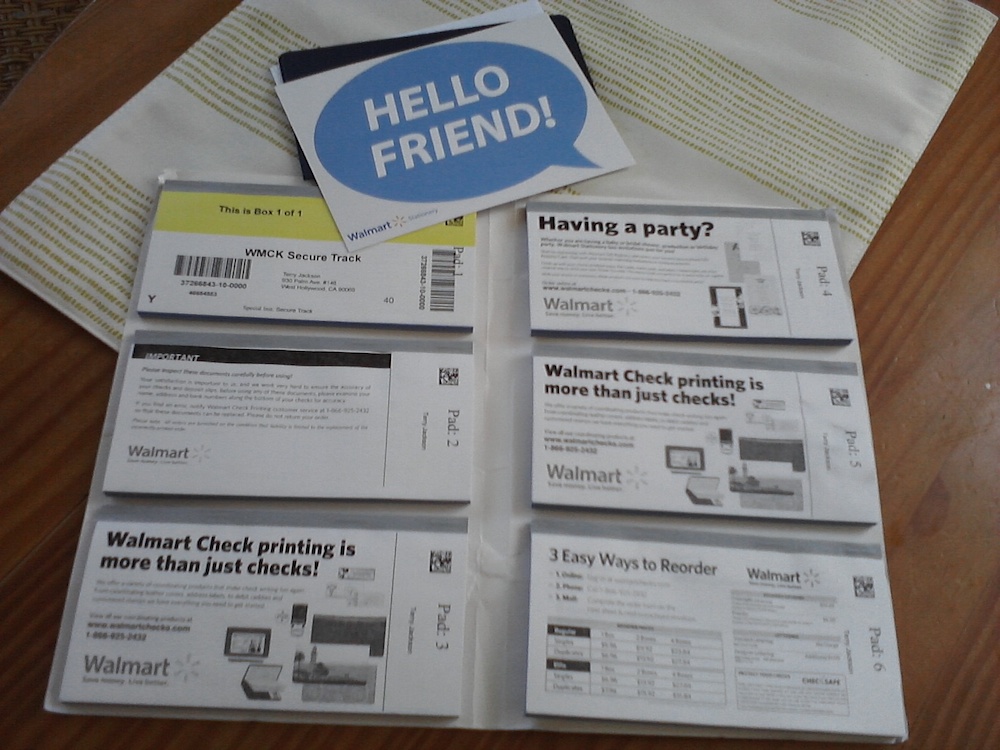 with rising or unprecedented (um, price per gallon gasoline) default-to or lazy-bones costs, did you know that walmart prints personal checks and supplies for use with your local financial institution (your bank)? yup, my roommate showed me (why i live - to receive these strange notions on your behalf) - just like those print-mail direct marketing magazines offering on back pages but with greater prides in mind...check it out