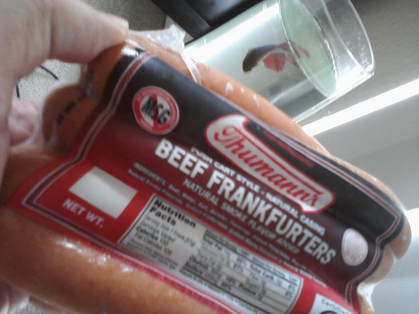 i stopped by sur la table for a long bamboo spoon replacing the one i damaged $6-$7 and some franks from marcona's meats farmers market $8 thumann's beef franks squirmy pack 'linked'