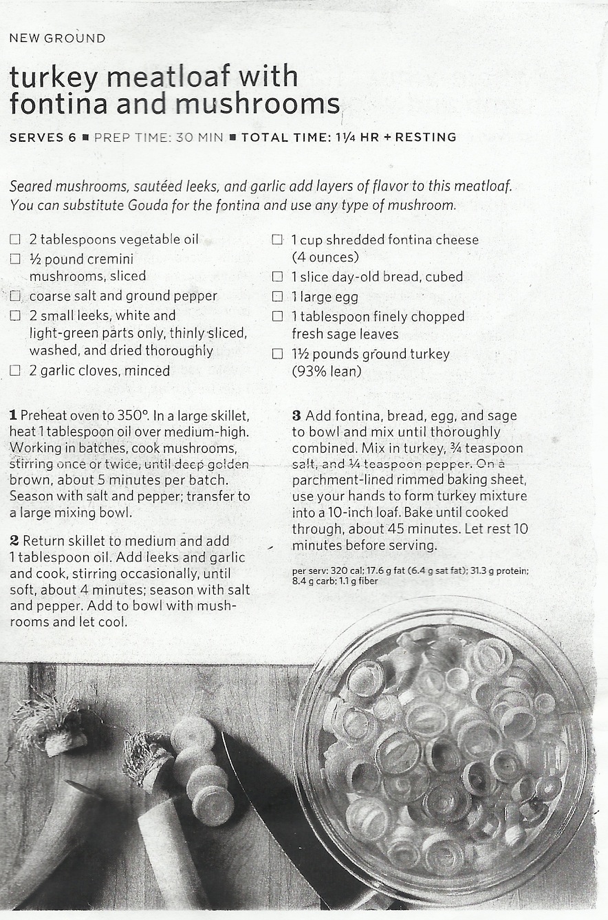 here's the turkey meatloaf i enjoyed i don't know what fontina is...i could certainly ask myself but hate the answers? good meal martha stewart the oatmeal cookies that follow are simple yet nice to eat too for a soft pallate (oreos? almost too hard)