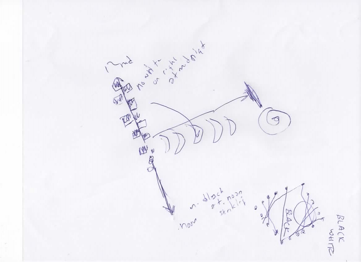 the hands blend to form black with a curve measured in time five up like five out - you don't make black or white it's the same line like pages in a book one after the other the same line forms black a curve in the center white is the vacuous upper part in the corner