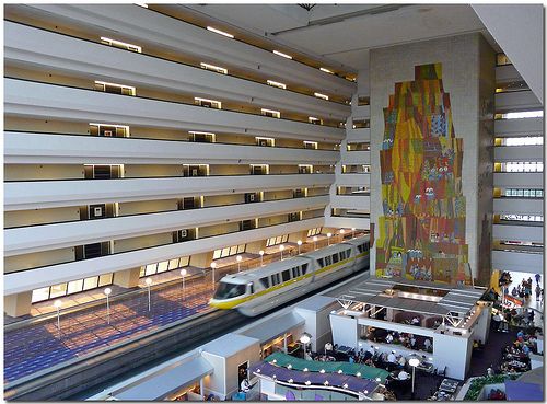 the contemporary at disneyworld: the disneyland hotel could been this the monorail runs to or past it only same kinda shape but a rectangle right in the parking lot with snow white 'disneyland' on it - one hotel, some dining within